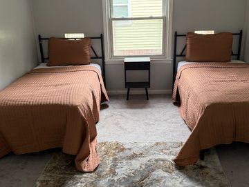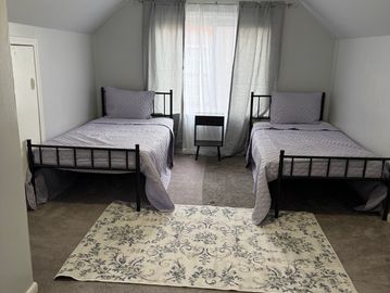 This suite includes two twin beds ample closet space along with dressers for storage and a Smart TV.